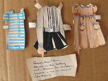 What was amazing was that the doll and her clothes were all hand-colored, very detailed and in good condition. The paper was starting to curve on some of the outfits, but the colors were still fresh and clean. Did someone make these for her? Were they purchased for her from an artist? Was she the model for this doll?
