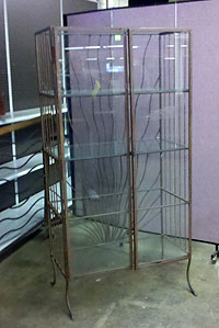 Wrought iron contemporary curio cabinet (one glass door and shelves missing), $325.