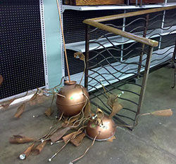 Two modern-style chandeliers (got broken in shipping), $25. Modern design iron railings (2 sets), $350.