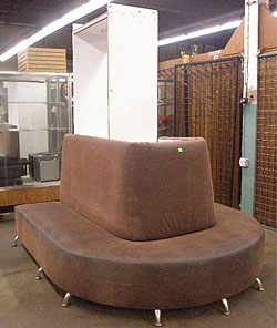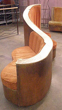 But it’s hard to get excited about an S-shaped cushioned chair with wavy stripes, a U-shaped leather banquette, metal railings, knotty-pine shelving and copper chandeliers. But that’s what was up for bids last weekend at one of my favorite auction houses. They were the remnants of an upscale women’s shoe store called Stiletto that closed last year.