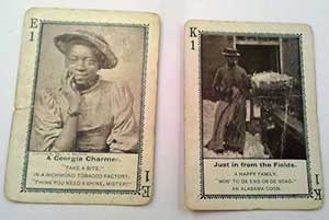 I came across the cards during a preview of the sale and instantly wanted take a look because they appeared different. The last set of similar playing cards I had come across were Old Maid cards from around the 1940s and 1950s. One deck contained stereotypical images of African American adults and another of children. And these were not the only such games distributed: The Jim Crow Museum of Racist Memorabilia noted others in an historical article on games that featured African Americans in less-than-flattering images.