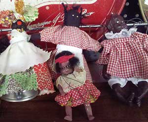 Four dolls were lying there on a tray at the auction house, along with a modern-looking plaque and a pin cushion with a little black boy on top eating a watermelon. How I hate those stereotypical images. Another doll wore a red band around her head, giving her the look of a Native American. The dolls appeared to be vintage.