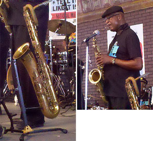 Before Fred Wesley and the New J.B.’s came on, the dance floor and the air were jumping with the sounds of the Monitors, a 1960s Motown group. As I stood there listening to them, I spied this huge saxophone, a little paint missing but an eye-catcher. Later, I listened as its musician-owner blew out a sound that was as beautiful as the instrument and as big as it was large. I love the sax.