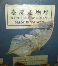 As I approached the large picture-frame case with the butterflies, I sighed when I saw the words “Made in Taiwan.” It seemed like a disappointing let-down to what I had seen on the auction-house website of some beautifully mounted butterflies.