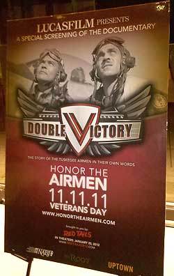 The documentary is called “Double Victory,” in reference to their fighting for victory against racism at home and fascism in Europe. It is a prelude to the George Lucas film “Red Tails” scheduled to be released on Jan. 20, 2012. This riveting documentary is currently being shown in five cities to whip up support for the movie, which tells of the exploits of the Tuskegee Airmen of the 99th Fighter Squadron, the 332nd Fighter Group and the 477th Bombardment Group. The documentary will also be aired on Jan. 20 on the History channel.