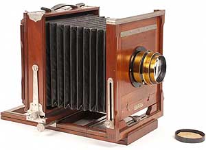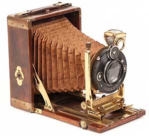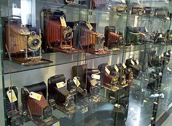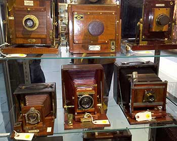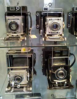 The shiny teak wood and brass seemed to sparkle under the glare of overhead lights in a case near the front. The cameras were monstrously big (you wonder how anyone was ever able to carry them around and then hoist them on a tripod). As I rounded the corner, I was equally dazzled by glass showcases stacked with shelves of black cameras, some with extended red bellows.