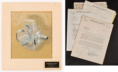 Original 1949 Raymond Loewy Associates drawing of a prototype design for a 16mm Victor Movie Camera with related documentation, invoices and correspondence. Raymond Loewy was commissioned by the Victor Animatographic Corp. in Davenport, Iowa, to design a new 16mm motion picture camera. The drawing is colored pencil on paper, matted with an 8-ply mat. It was given to Kaprelian by Morris Schwartz, founder of the Kalart company. $325.