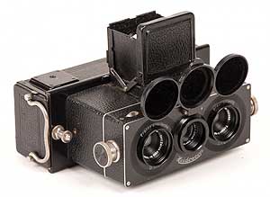 Heidoscop Stereo Camera with 3 Carl Zeiss Jena Tessar lenses and leather case. Manufactured by Franke & Heidecke in Braunschweig, Germany. $700.