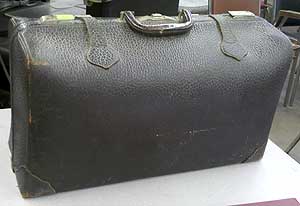 I loved, though, the two old-style stiff leather doctor bags – one caramel-colored and small ($90), the other a big bulky black visitation bag ($80) that I’m sure the doctor hauled to peoples’ homes. There were gauzes and bandages still in boxes, stomach pumps, medicine bottles, stethoscopes, microscopes (including a brass one that went for $275), clamps, hypodermic needles, bed pans (“planters,” the auctioneer joked of these 19th-century models), syringes, metal and wood splints, surgical instruments.