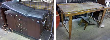Furniture was set up against the walls: a beautiful dark wood examination table with a black leather cushion (it went for $30, guess no one knew how to recycle it), a metal office cabinet ($300), a walnut twin bookcase from Isidor P.’s library ($475), an adjustable exam chair and stool ($160), a plain-looking maple exam table with a foot step ($200) and an oak cabinet slant-lid desk ($375).