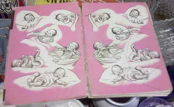 The front inside page from "Nicodemus and the Newborn Baby." The baby's lips - like the lips of everyone in the book - are pink to match the color scheme of the book. These drawings are actually adorable.