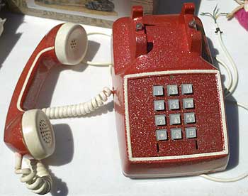 This phone did not appear to be the standard Western Electric device. It was red with beige trim and gold sparkly specks. It looked like someone had painted it to match a home décor. The paint was so meticulously done that not a single spot of the red overlapped onto the beige. It was so clean that one flea-market-goer wondered if it had been bought that way. I don’t think the company made phones in that color.