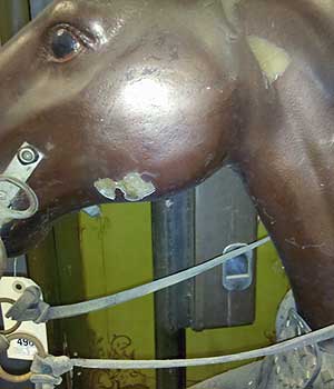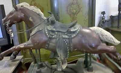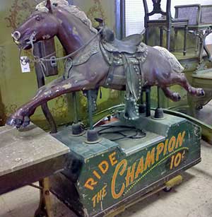 “I remember falling off of it,” she continued, her mind fixed decades ago when she was a child and a mechanical horse named Champion was a treat. The price on the front said 10 cents but I couldn’t figure out where to put the money. Recalling those days again, the woman pointed to a silver slot on a stand on the side near the front and opposite Champion’s head. It was the right spot for a child to easily lean over and slip in her dime as she sat in the saddle.