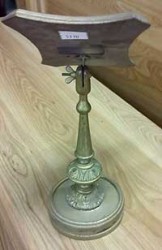 The buyer also permitted me to take a closer look at the piece. It was not brass but carved wood covered in what looked like gold paint or gold leaf, and was actually lightweight. In the back was a screw to adjust it. The stand was one of two up for auction that day. The losing bidder on the first managed to outbid the woman on the second one, which was made of a silver metal.