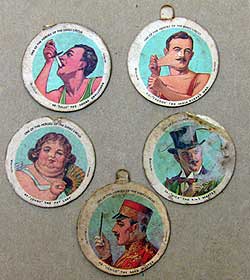 The lot contained 39 lids with colored lithographic images of circus animals and performers on one side and the names of two area dairies – Abbotts and Supplee – on the other. On the rim across the top on the image side – in several variations – were the words: