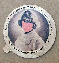 The batch of lids I bought at auction contained a mystery lid: “Playing in ‘The Affairs of Cellini.’ A Twentieth Century Production. … Who is this Mystery Movie Star?” Googling the movie, I found the mystery actress from this 1934 movie to be Constance Bennett, sister of actress Joan Bennett, a leading lady during the silent-movie era and one of highest-paid during the Depression.