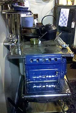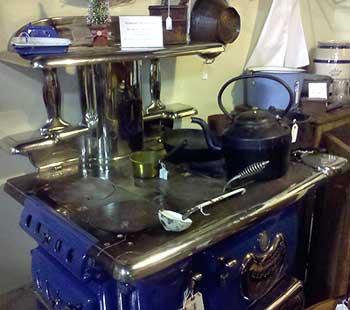 The stove was in remarkably good condition for its age, and the owner had placed vintage cooking items atop it, including an old kettle, spoon and small brass pot.