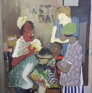 The painting depicted a group of women bargain shopping, in a style that the auction catalog described as social realism. Lewis produced other paintings of women during the Depression, according to the catalog, including “Dispossessed (Family)” and “Two Women Reading” in 1940.