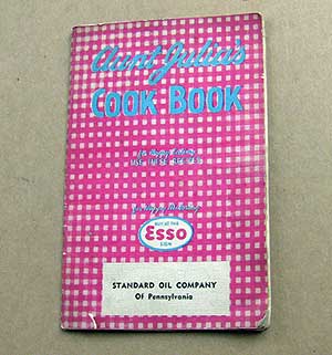I’m glad I did. The sack was hiding a red checkered paperback cookbook titled “Aunt Julia’s Cook Book … for Happy Eating Use These Recipes.” At the bottom were a logo for the Esso gas company and the name “Standard Oil Company of Pennsylvania.”