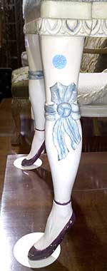 It had sky-blue suede-like upholstery and its legs and feet were carved like those of a woman wearing maroon ballerina shoes and a blue bow tied at the knee. How utterly … different, I thought. There were two of them, and I figured they were novelty benches meant to be a conversation piece. I didn’t think to turn them over to look for a maker’s name but they looked rather artistic.