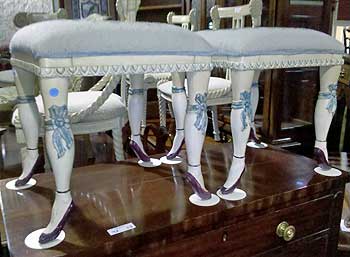 The light-colored seats were still clean, so I assumed that not much sitting had been done on them for fear of shattering the delicate legs. The benches were set up on a table among the antique furniture, perhaps to ensure that the curious didn’t feel obliged to take a seat.