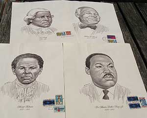 The reader was referring to prints by artist Cal (not Paul) Massey. I bought 12 of them at auction two years ago, and some had official U.S. postage stamps of the person in the drawing. The prints were first sold as a set in 1972, and four years later during the Bicentennial, they were sold with stamps.