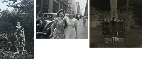 It contained a photo of two smiling women posing on a main street in a big city. On the back was inscribed: “1942. Age 21. While working at Dun & Bradstreet Inc.” There were also two negatives of three women posing in front of a tree in what looked like a park or a big back yard, and another of one of the three straddled in the trunk of a tree. Another photo showed a woman in a flowery dress posing in a wooded area.