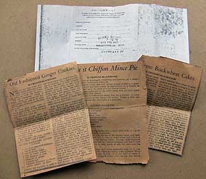 This little plastic box was stuffed tight with faded index cards bearing handwritten and typed recipes, alphabet dividers, along with recipes torn from food boxes and clipped from newspapers. An unused 8-cent Eisenhower stamp (it first came out in 1971) was lying in the bottom of the box.