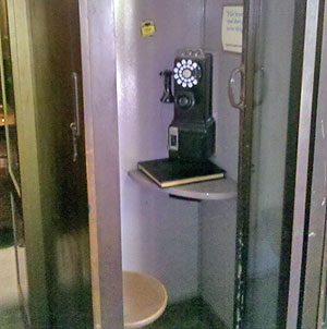 The booth’s folding glass door was open, exposing a 1950s rotary telephone with slots for 5 cents, 10 cents and a quarter, and a low wooden ledge for a seat.
