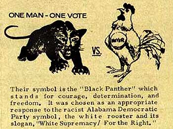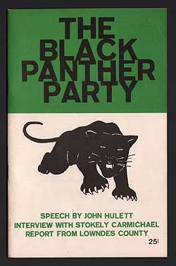 In the summer of 1965, Stokely Carmichael and other members of the Student Nonviolent Coordinating Committee (SNCC) went to Lowndes County, Alabama, to help register voters. A political party called the Lowndes County Freedom Organization was formed and became referred to as the Black Panther Party when they adopted the black panther as their emblem to counter the Alabama Democratic Party symbol of a white rooster and its slogan “White Supremacy/ For the Right.” The EncyclopediaOfAlabama.org website is a great resource for this history. (One of the organizers of the freedom group was a local activist named John Hulett, who had founded the Lowndes County Christian Movement for Human Rights.)