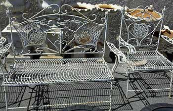 The garden furniture sat in good company – among them a lovely black S-shaped bench with an open looped design on the back. It’s called a tete-a-tete or kissing/conversation/courting garden bench – the word literally means “head to head” in French. Tete-a-tete benches were popular in Victorian period, – especially in lobbies in Europe, according to one website – for kissing and quiet conversing.