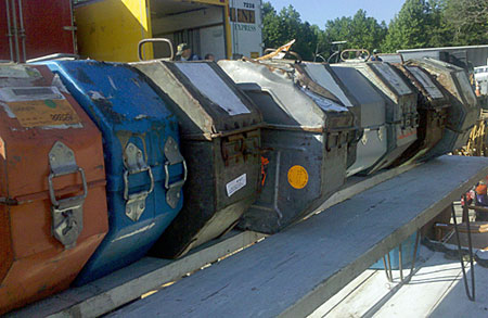 There were almost two dozen of them in orange, blue and dull gray, octagonal in shape (two were in the shape of computer towers), about 8 inches wide. Most were dented and rusted.