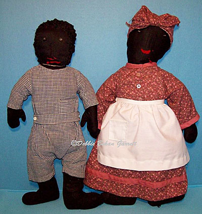 The oldest dolls I own are a pair of handmade cloth dolls, circa 1870, a male and female couple made of silk and cotton. The female is dressed in traditional mammy attire: a head scarf that matches the floral print of her dress and white apron. She has no hair. The male has black knotted yarn for hair. Both have button eyes and embroidered mouths. These were given to me in 2005 along with their written provenance. Their previous owner, Elizabeth S. Darrah, inherited them from her great-grandmother, Anna Frances “Fanny” Skinner Henry, who was born in New Jersey in 1849 and died in 1940.