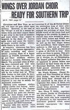 Wings was formed by the Rev. Glenn T. Settle of Gethsemane Baptist Church in Cleveland around 1937 and lasted for more than a decade. The group could be heard every Sunday morning on the radio and in concerts across the country. Overstreet and Dandy were in the group in the 1940s, so we can assume that those were the years when your mother also performed with it. Initially, potential choir members auditioned in Cleveland, but as the numbers dwindled, auditions were held in cities where Wings performed.
