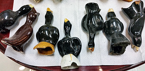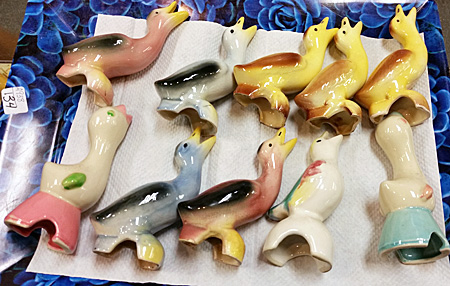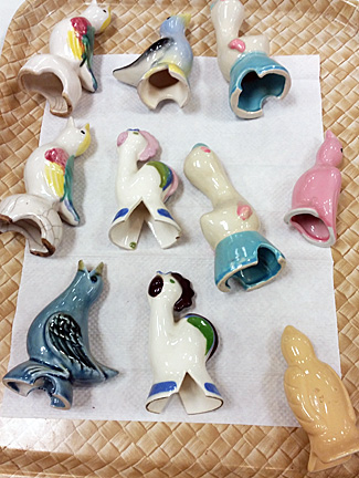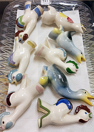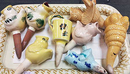 When I saw the tray of ceramic birds, I thought they were those cute little items you stick into a potted plant to water it as the soil dries out. These were much too lovely and delicate for grimy soil, but I had no idea what they were.