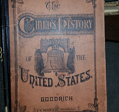The title, “The Child’s History of the United States,” was written in a fancy calligraphy script on the cover. The book was written by Charles A. Goodrich, and reprinted in 1878 (Goodrich died in 1862).
