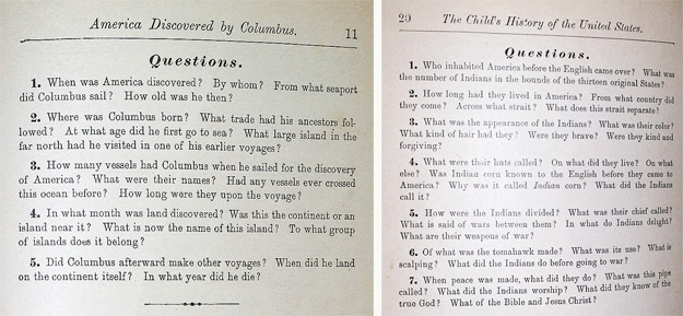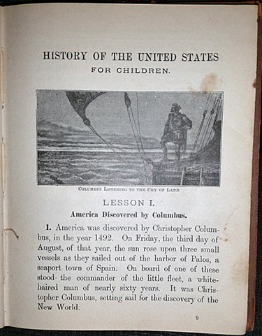 “America was discovered by Christopher Columbus, in the year 1492. On Friday, the third day of August of that year, the sun rose upon three small vessels as they sailed out of the harbor of Palos, a seaport town in Spain. On board of one of these stood the commander of the little fleet, a white-haired man of nearly 60 years. It was Christopher Columbus, setting sail for discovery of the New World. … At length the eyes of Columbus and his companions rested upon a New World, and, on the 12th of October, they stepped ashore upon a little island belonging to a group since called Bahamas, one of the West Indies. Columbus gave it the name San Salvador.”