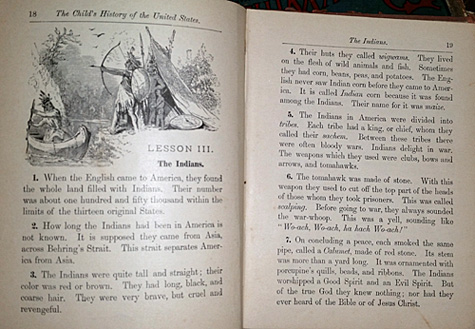 Indians were very prominent in the books, because they were all around the white colonists and interacted with them (by the late 1800s, they were not seen so often after being killed in battle and forced onto reservations). Textbook writers faced a dilemma about how to portray a nation of people who were being wiped out. If the Indians were presented as virtuous, it would be tough to justify taking their land. If they were shown as savages, the taking could be better justified.