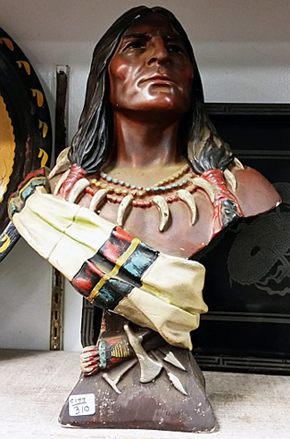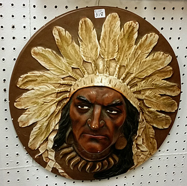 He’s not looking right at you, he’s looking past you, the auction-goer observed as I stood looking myself at a wall plaque of the plaster bust of a Native American chief. I was standing directly in front of the figure, and he did appear to be looking beyond me.