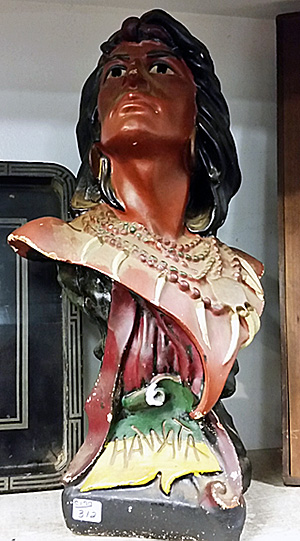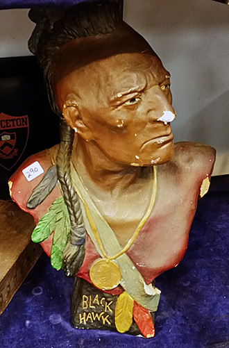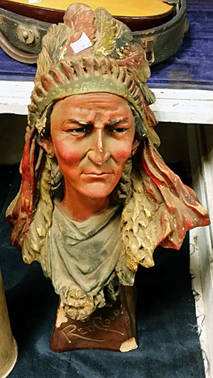 This plaque was not the only plaster figure for sale at auction recently. On shelves not far away were painted plaster busts of four other figures: Hiawatha, Red Cloud, Black Hawk and one, like the plaque, that was not identified. I could find no manufacturer’s name on either of them. All had some chips in the plaster from age and handling, and could use a good cleaning.