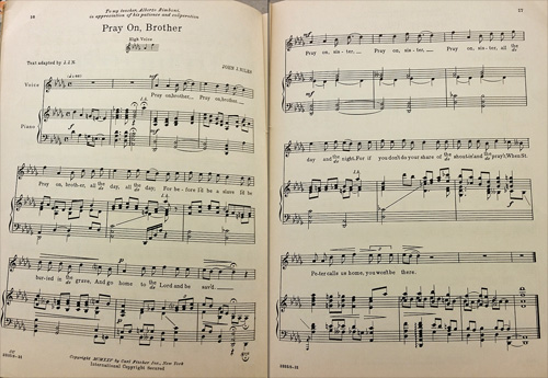 Niles wrote in the book’s Foreword that the songs were the “impressions gained while attending Negro Camp-meetings in Kentucky. They are based on traditional tunes but are absolutely not the so-called spirituals.” He was careful not to call the eight songs spirituals. They were said to be based on the style of impressionist composers.