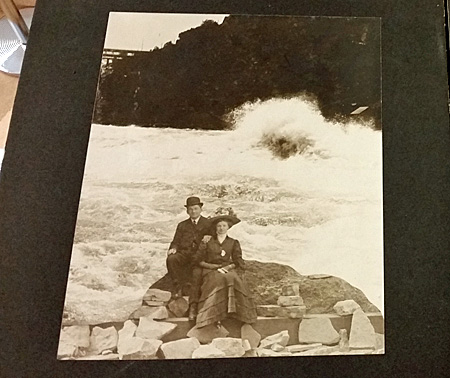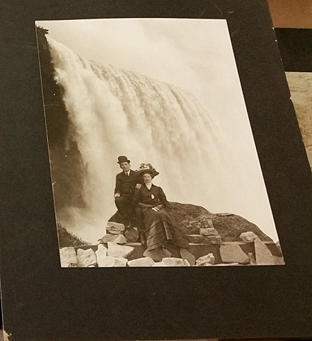 I thought about their two memories of Niagara Falls recently when I came across a photo of a couple from the early 20th century who were pictured with the falls as a backdrop. There were two black and white photos of them in their Sunday best, sitting on a boulder, surrounded by large rocks as two different views of the falls splashed behind them. Their photo appeared to have been placed on top of a photo of the waters.