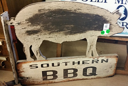 It didn’t end there. In another room were tables of rusted metal pigs, a pig weather vane, a wooden Southern BBQ sign (nice!), a pig and piglets print hanging on a wall, and more.