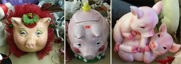 An array of cute pigs: A Christmas pig, a pig cookie jar with an absentee bid and playful piglets.