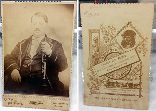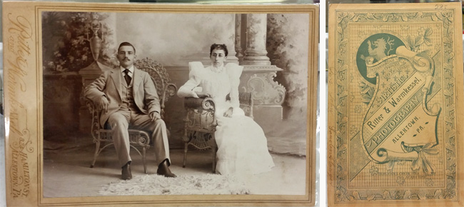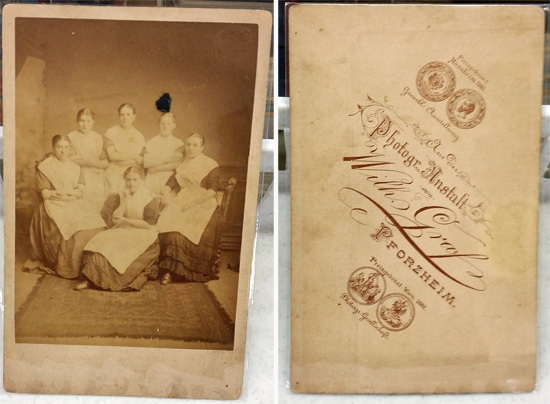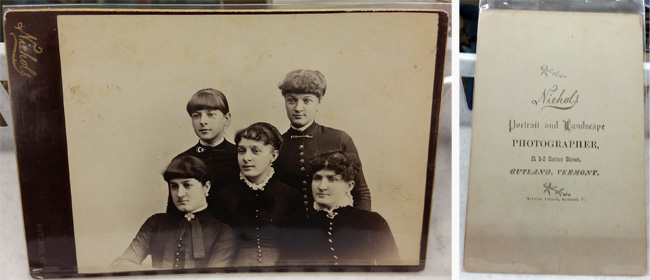 Cabinet cards were very prominent during the latter part of the 19th century, with people dressing up to be photographed in local studios. The photos were affixed to stiff 4″x 6″ cards with the photographer’s name usually on the front – and always on the back – in fancy lettering and designs. They were called cabinet cards because they could easily be set up in a cabinet in the parlor of a home.