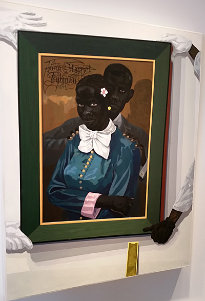 One of my favorites was a portrait of John and Harriett Tubman titled “Still Life with Wedding Portrait (2015),” of Tubman and her first husband. The painting also showed three hands in white gloves and one in black gloves positioning the portrait on a wall. (Interestingly, the painting had sold at auction in 2015.)