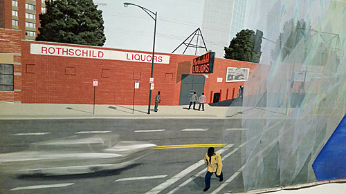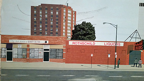 The right half  (and some of the left) of the painting “7am Sunday Morning” by Kerry James Marshall.
