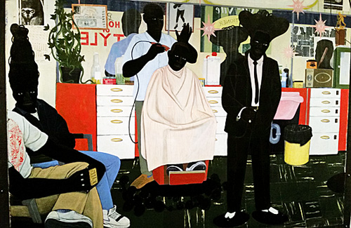 When I saw the first almost-covering-the-wall painting by Kerry James Marshall, I zeroed in on the charcoal black faces of the men who peopled it. They were in a barber shop, much like any you’d find in any black neighborhood in any city in this country.