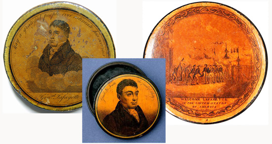 It’s not clear what that box was, but commemorative snuff boxes were made on the occasion of the two-year trip by Lafayette, who was accompanied by his son George Washington Lafayette. Some boxes bore a portrait of Lafayette, while at least one other showed him landing in the United States. One seller surmised that a box with clouds beneath Lafayette’s bust was likely made as a memorial around the time of his death in 1834. Snuff was commonly used and seen as a luxury back then.