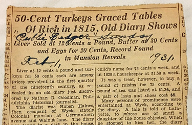 The article appeared in the Sunday, Feb. 1, 1931, edition of the Public Ledger newspaper. The diary itself was found in a desk in the house, which dates to the 1700s. Haines and his wife Jane Bowne Haines had the house architecturally updated in 1824.